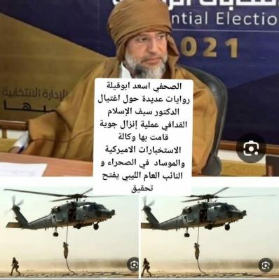 ويستشهد أبوقيلة بتصريح محامي الدكتور سيف الإسلام، الفرنسي مارسيل سيكالدي، الذي قال لقناة الحدث السعودية إن موكله “قُتل على يد فرقة كوماندوس مكوّنة من أربعة أشخاص داخل منزله في الزنتان”، مضيفًا أن “سيف الإسلام كان يشعر بالخطر قبل نحو عشرة أيام من اغتياله”.