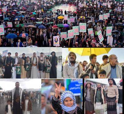 وبعزيمة وإرادة قوية وعقيدة راسخة، جدّد شعب الإيمان والحكمة العهد بالمضي على خط الجهاد والتضحية في سبيل الله والتمسك بخيار المقاومة لمواجهة أشرار البشرية وأعداء الأمة والإنسانية الصهيونية العالمية بأذرعها "الأمريكي، والإسرائيلي"، وأذنابهما من أنظمة الغرب الكافر وعملائهم في المنطقة.