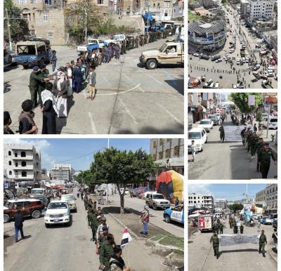 صنعاء نيوز - نظمت اليوم إدارة أمن مديرية المشنظة بمحافظة إب"وسط اليمن" والشرطة المجتمعية بالمديرية ، مسيراً عسكرياً راجلاً ، ووقفة مباركة